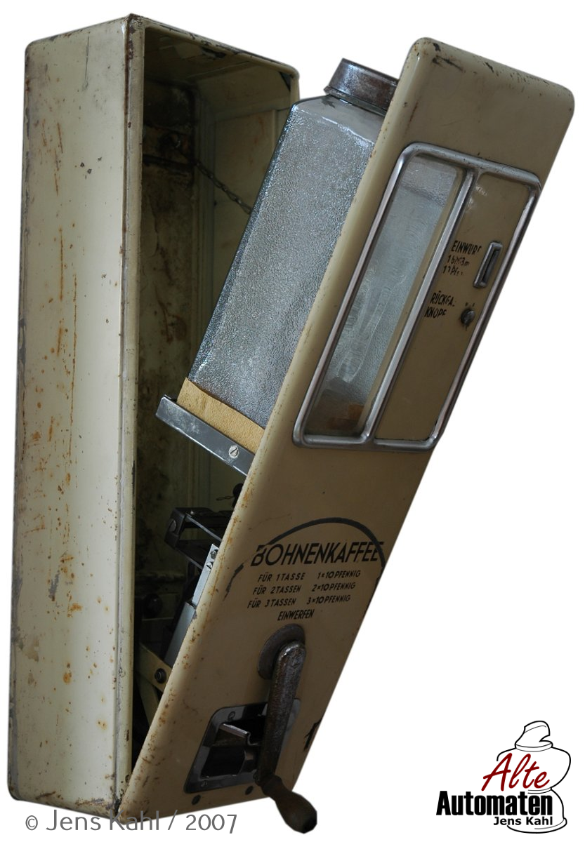 Kaffeebohnen können nach dem Einwuf von Geld gemahlen werden. 1 x - 3 x 10 PF können eingeworfen werden und bestimmen so die Menge des Kaffeepulvers.