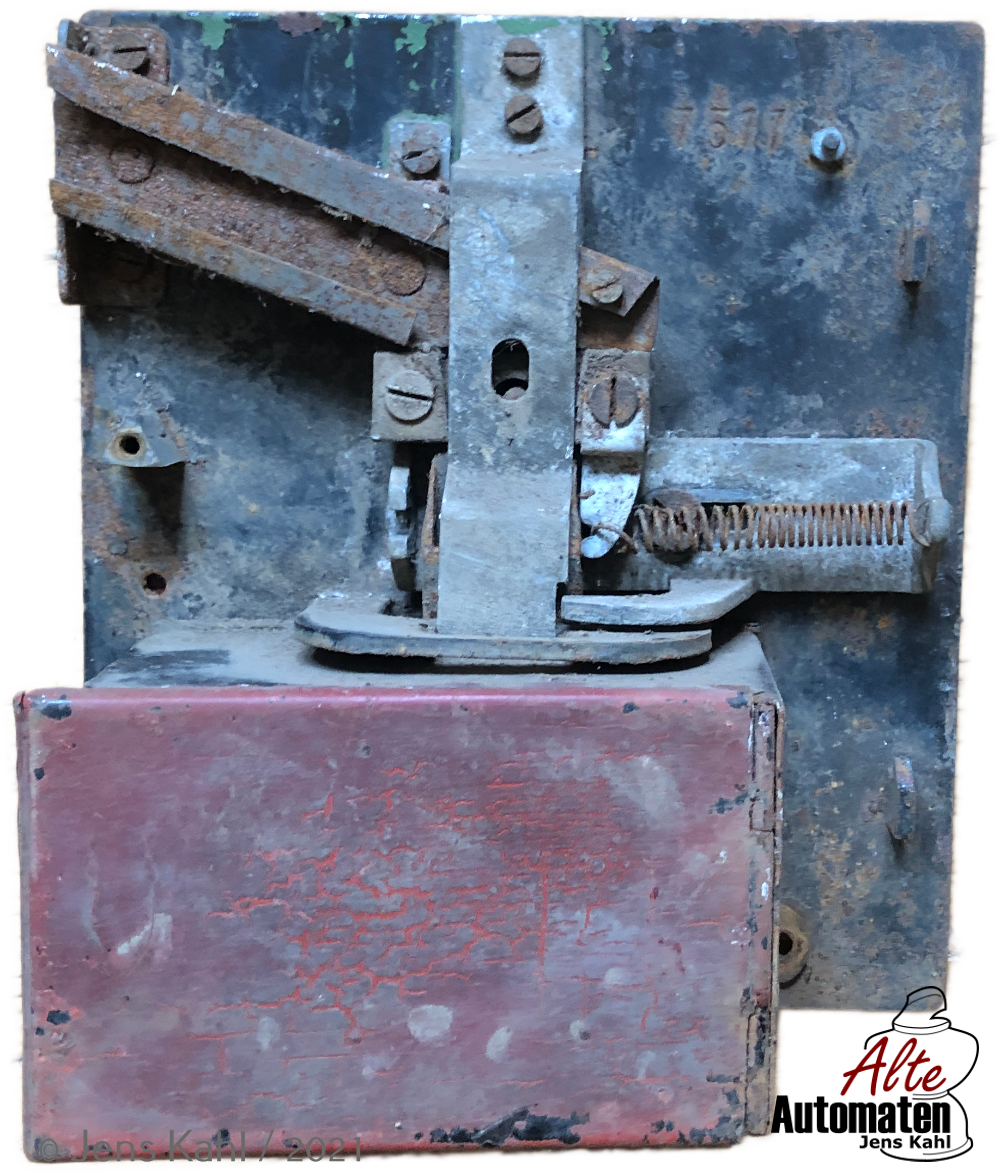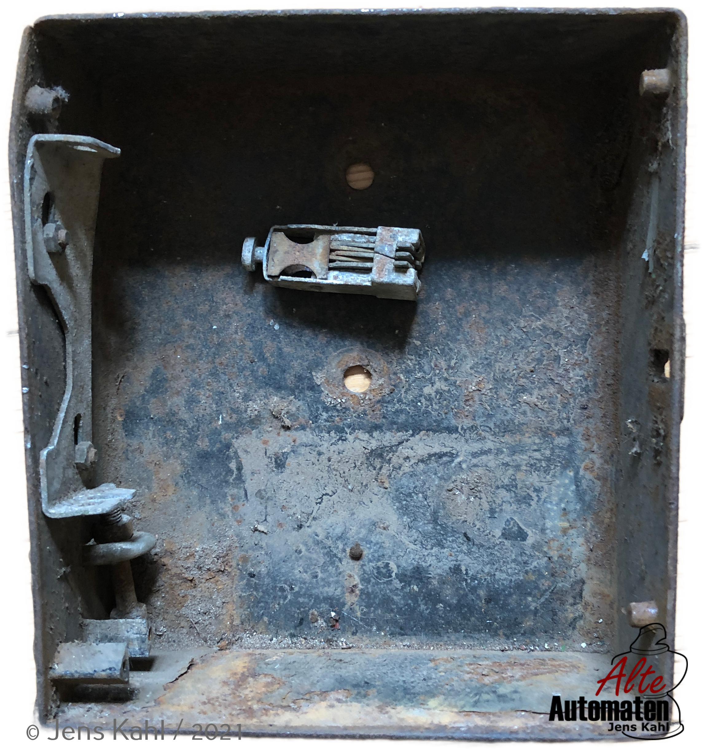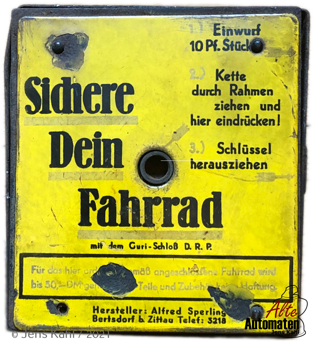 An diesem Automaten konnte man sein Fahrrad gegen eine kleine Gebühr von 10 Pf. anschließen. Dieser Automat stammt sehr wahrscheinlich aus der Zeit nach 1945, da auf dem Emailschild DM angegeben ist. Es gab diese Automaten aber auch schon in den 30er Jahren. Dieser Automat verfügt über sogenannte „Curi-Schlösser“, diese wurden bis zur Wende in der ehemaligen DDR produziert. Später gab es noch andere Modelle. Ob diese auch vom gleichen Hersteller sind, kann nicht gesagt werden, sie unterscheiden sich u.a. durch die verwendeten Schlösser. Der Automat ist in einem sehr schlechten Zustand.