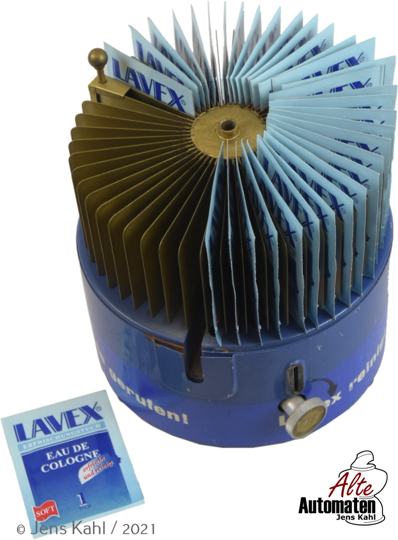 Dieser Automat stand wahrschlich in Toilettenanlagen. Da der Automat ein Tischgerät ist und keine Sicherung vor Diebstahl hat, wird dieser sicherlich nicht in öffentlichen WC-Anlagen aufgestellt worden sein. Es gibt von diesem Automaten zwei verschiedene Bauformen / Designe, die sich in der Lackierung und evtl. in der Größe der Warenausgabe unterscheiden. Auch der Herstellungszeitraum und die Verwendungsdauer ist nicht geklärt. Nach dem Designe und der Bauart kann man von einem Zeitraum zwischen den 60er- 70er Jahre ausgehen. Die Papierfabrik Lavex gehörte in den 70er Jahren zum Quelle Konzern.