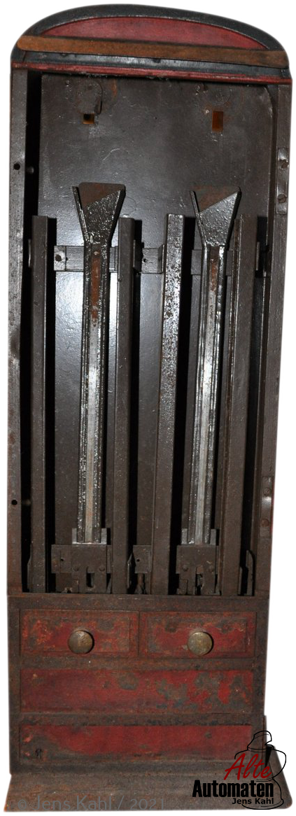 Klassischer kleiner Warenverkaufsautomat Mitte der 20er Jahre, evtl. sogar früher. Der Hersteller ist unbekannt. Sehr einfache Mechanik. Die Verwendung eines Spiegels sprich für eine frühere Produktion. Das Glas ist nicht extra gesichert, man kann davon ausgehen, dass der Automat nur zu Geschäftszeiten vor dem Ladengeschäft hing. Der Automat verabreicht zwei verschiedene Waren. In einem Schacht Rollenwaren oder Stangen und im zweiten Schacht rechteckige Warenpackungen. Beide Warenschächte haben getrennte Münzprüfer.
